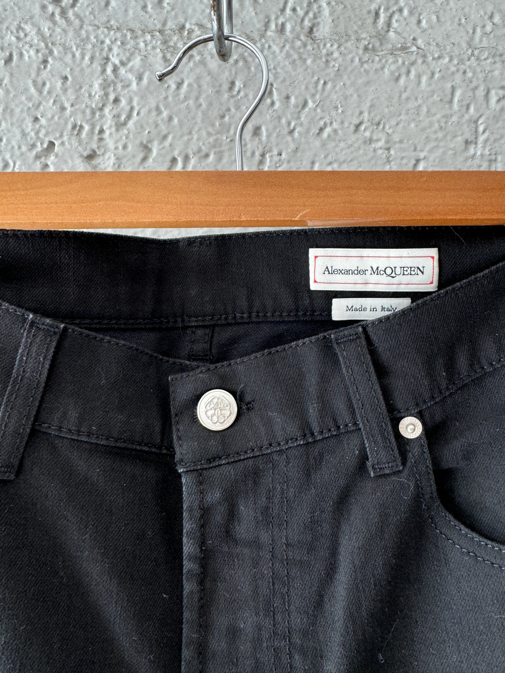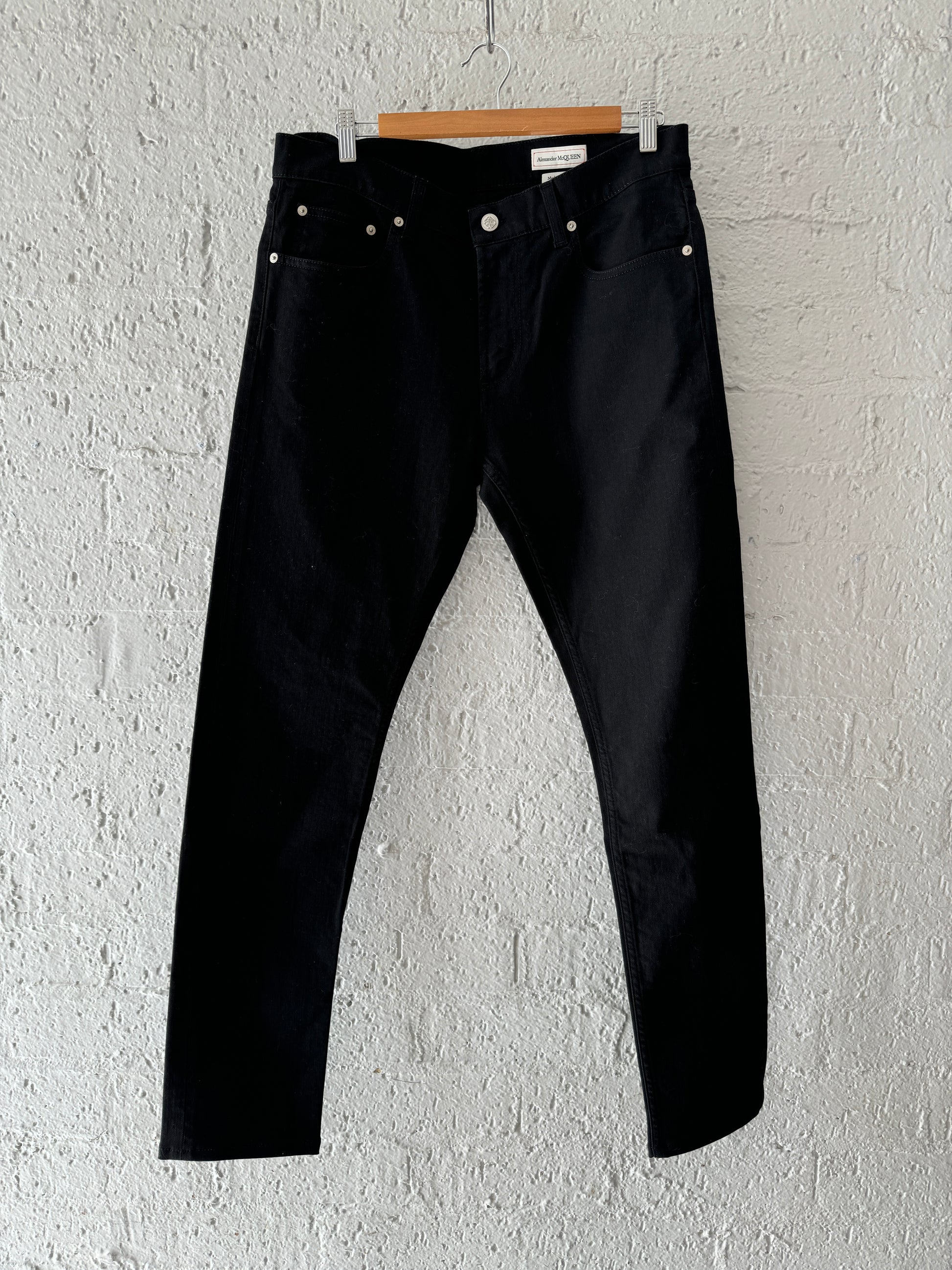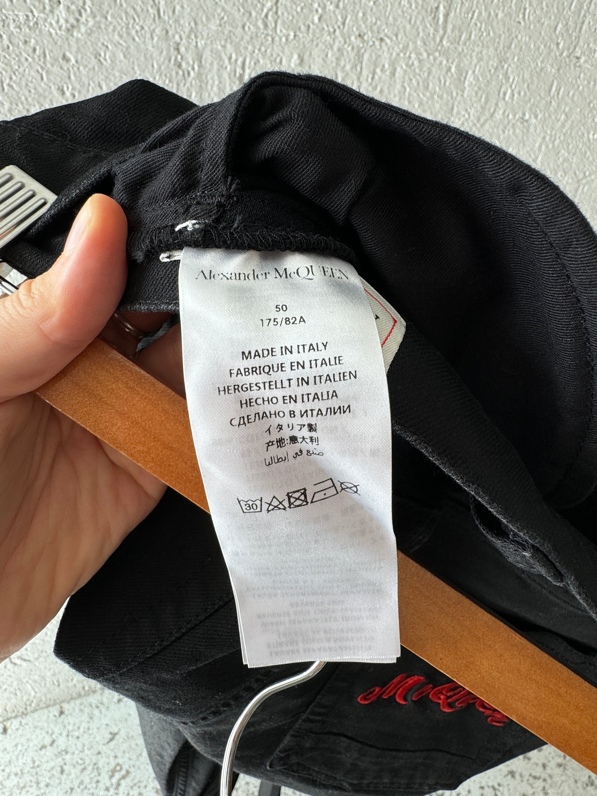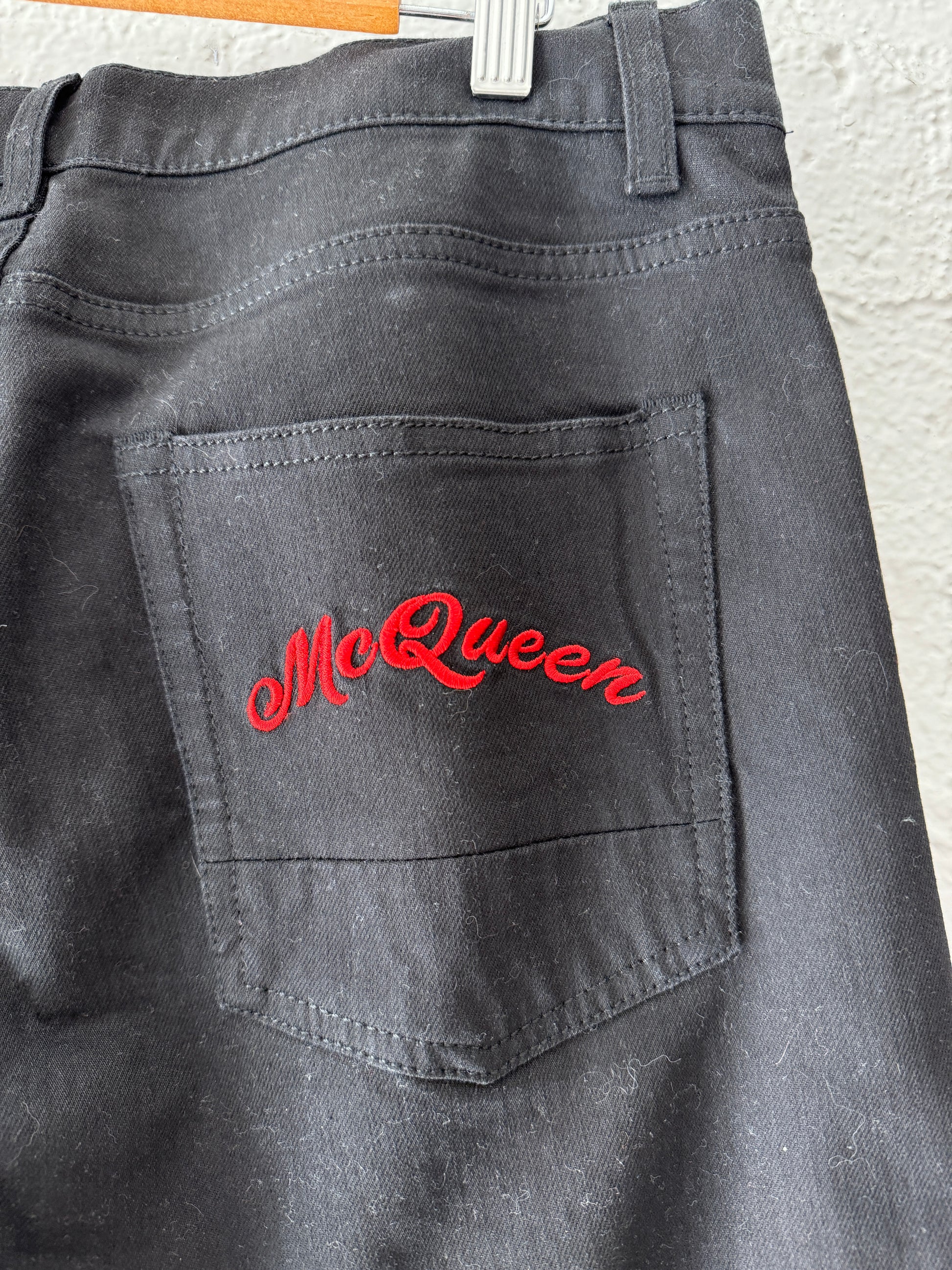 Alexander McQueen black jeans with red stitching detail on back pocket. Size IT50 (AU40 - M). Made in Italy. 98% cotton 2% elastane.