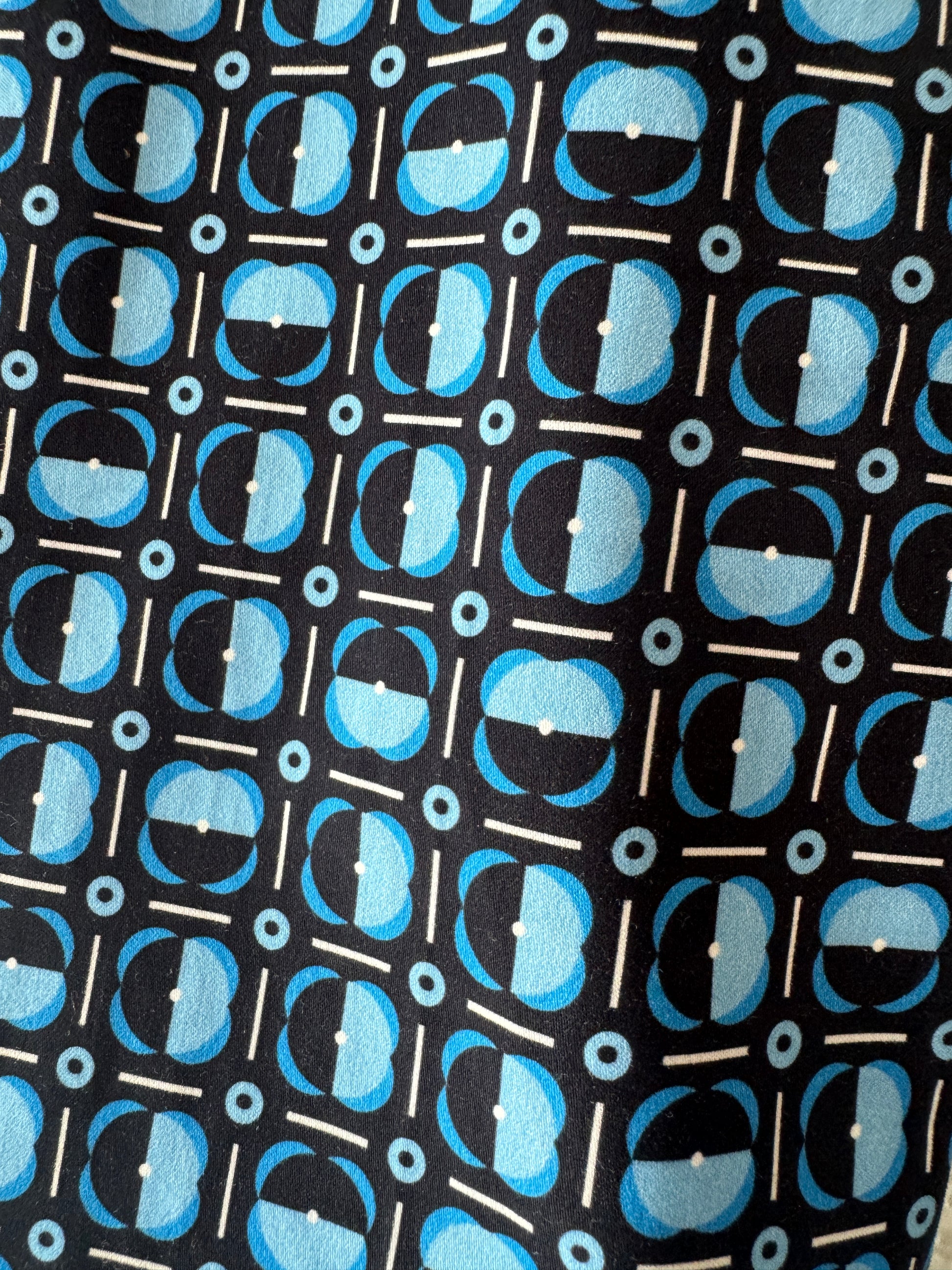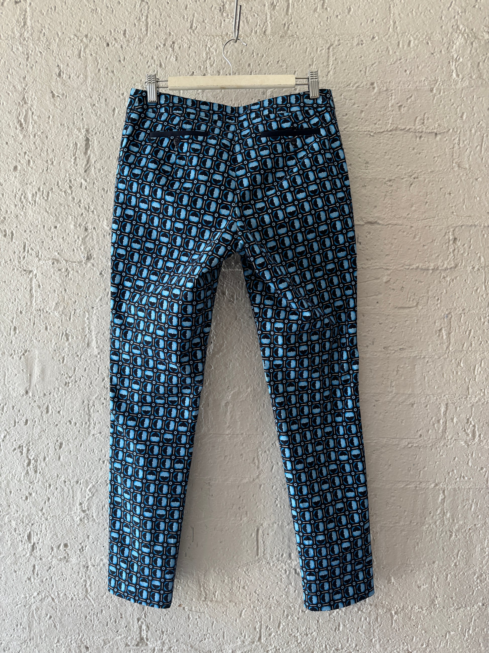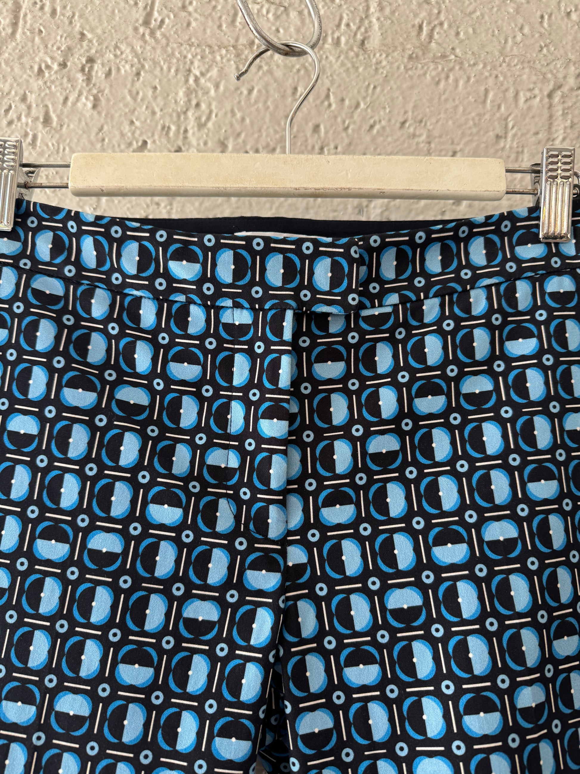 Anna Thomas pants in a retro blue pattern. Button and clasp fastening. Size AU8. 97% cotton 3% elastane.