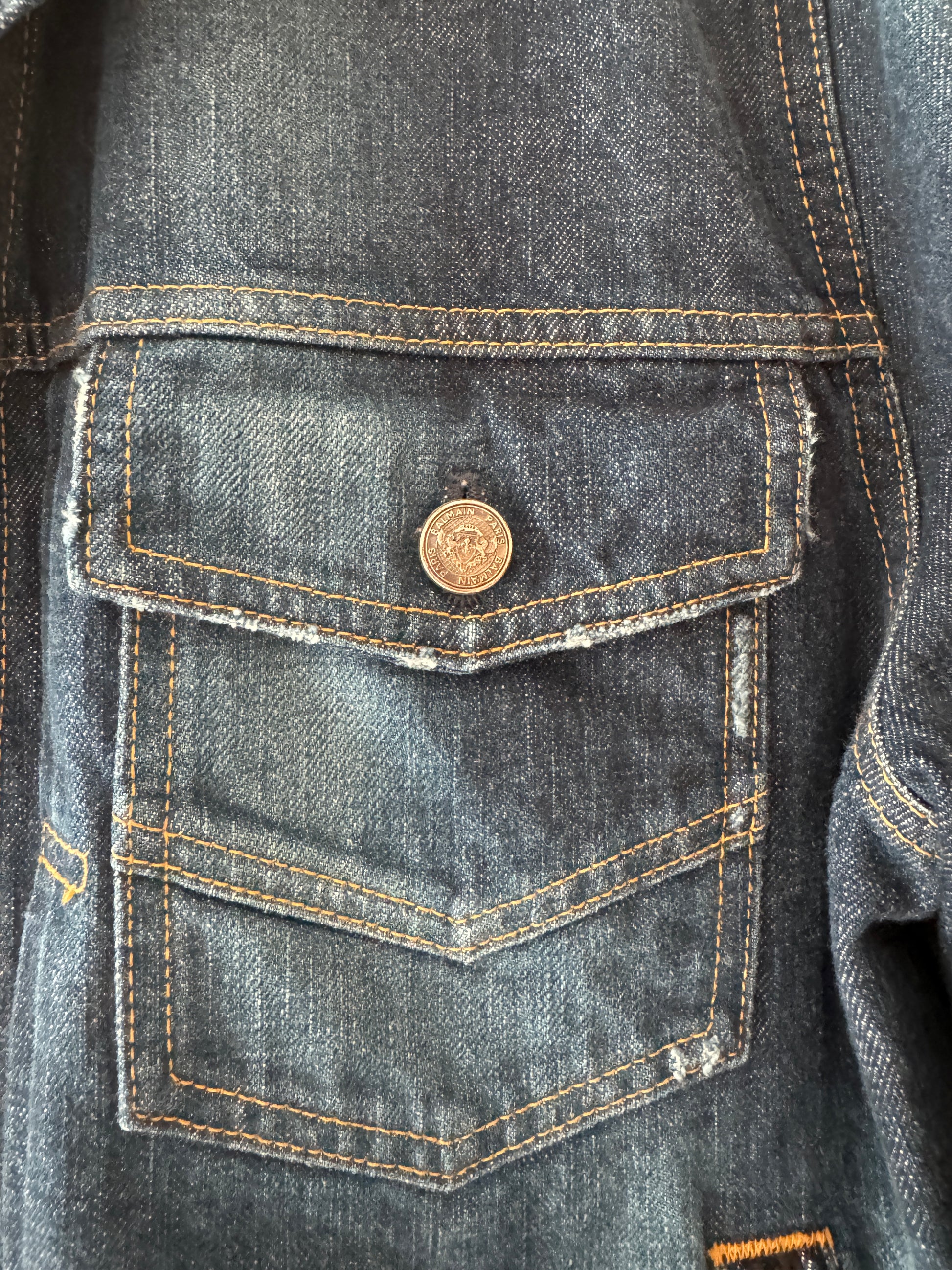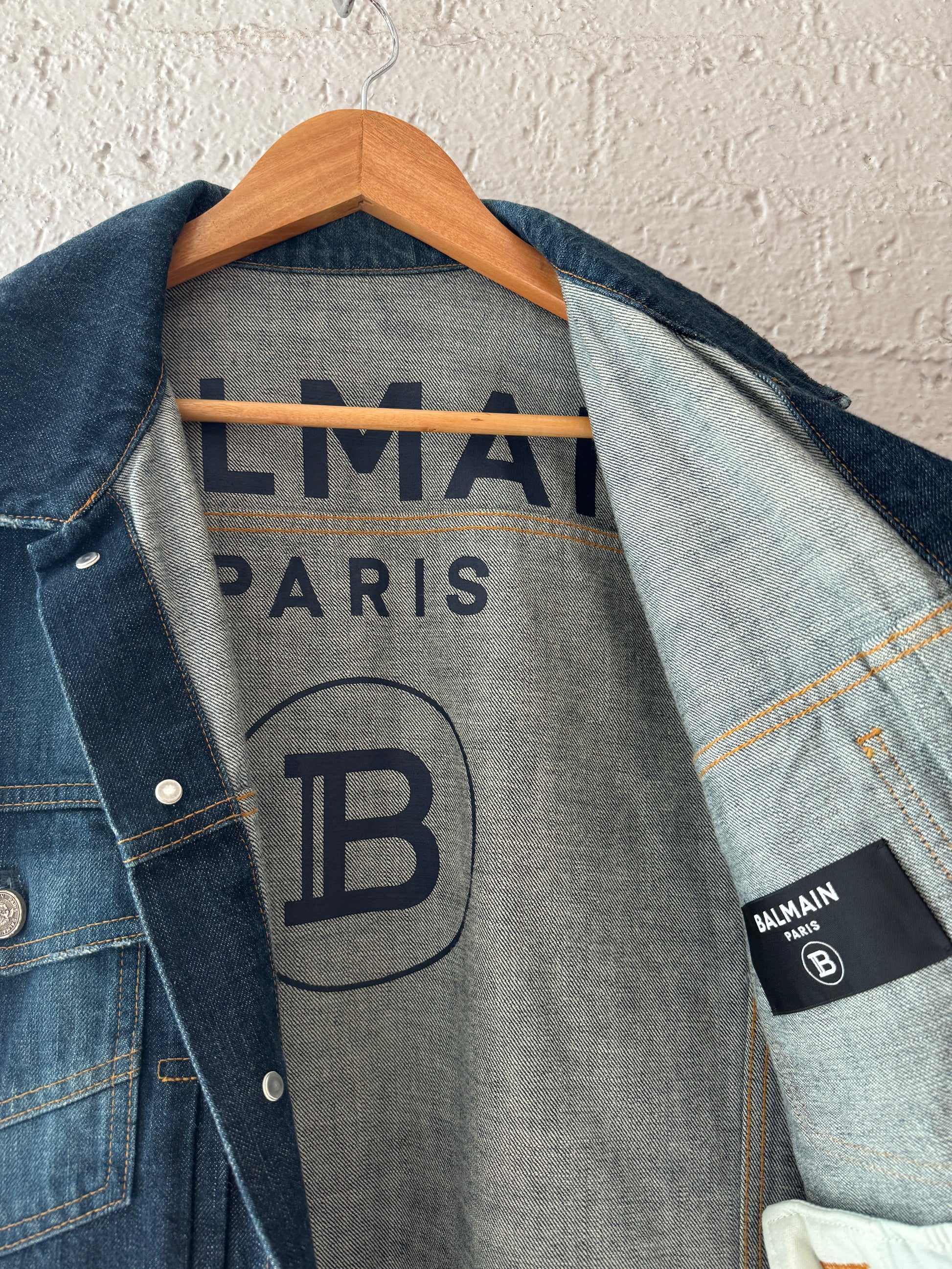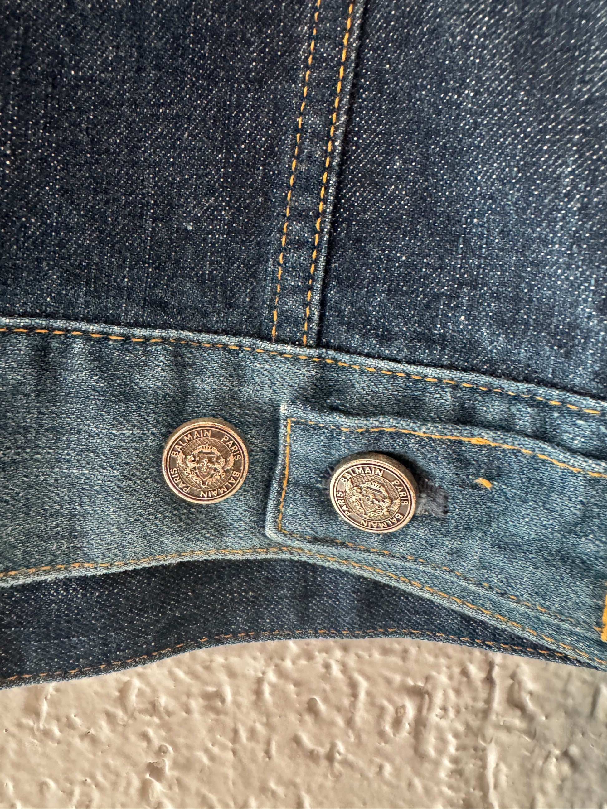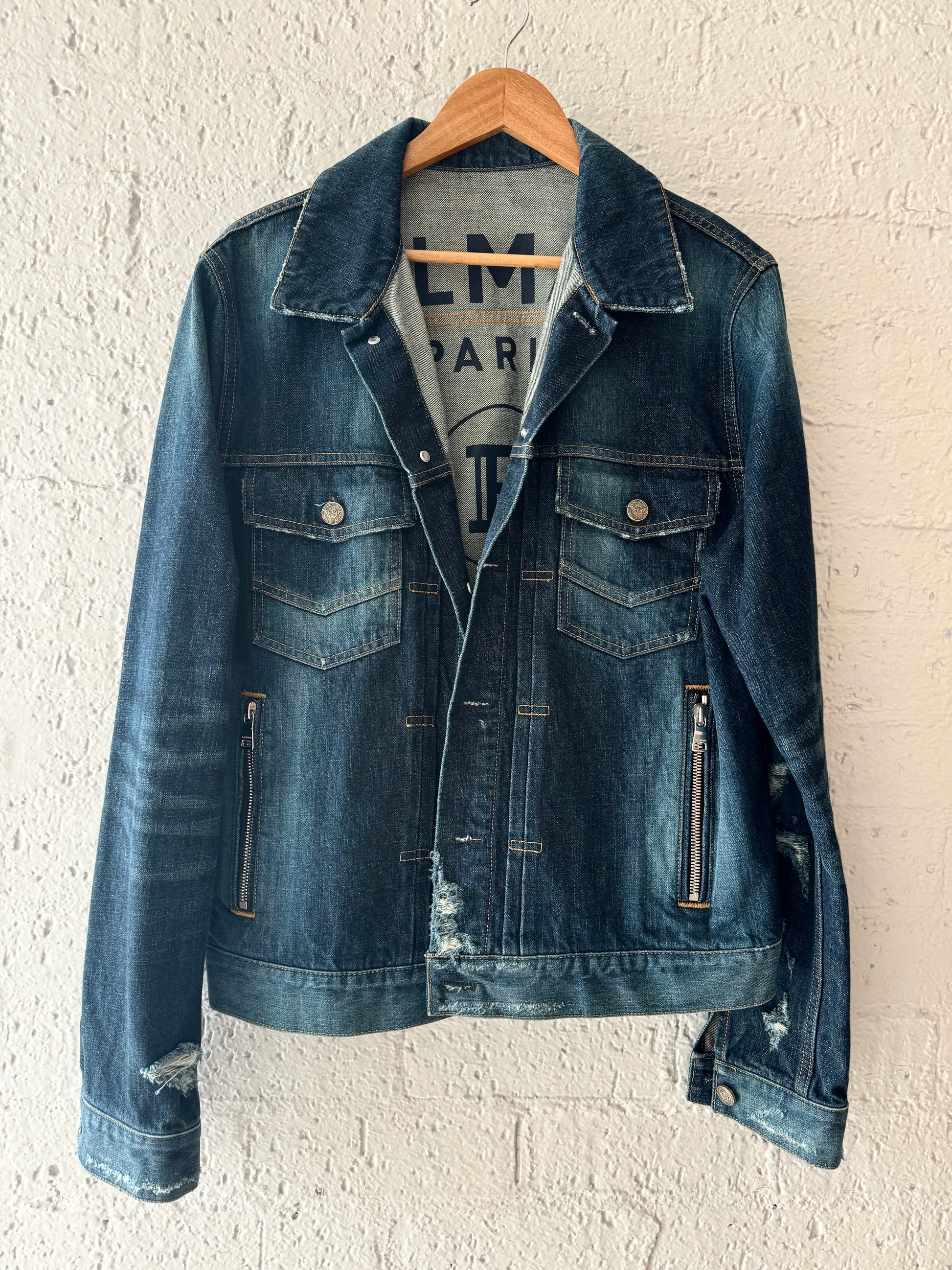 Balmain denim jacket in a size men's 42 (L). Silver hardware and intentionally distressed look. 100% cotton. Heavy and beautiful quality. RRP $1500.