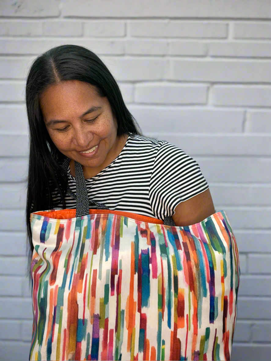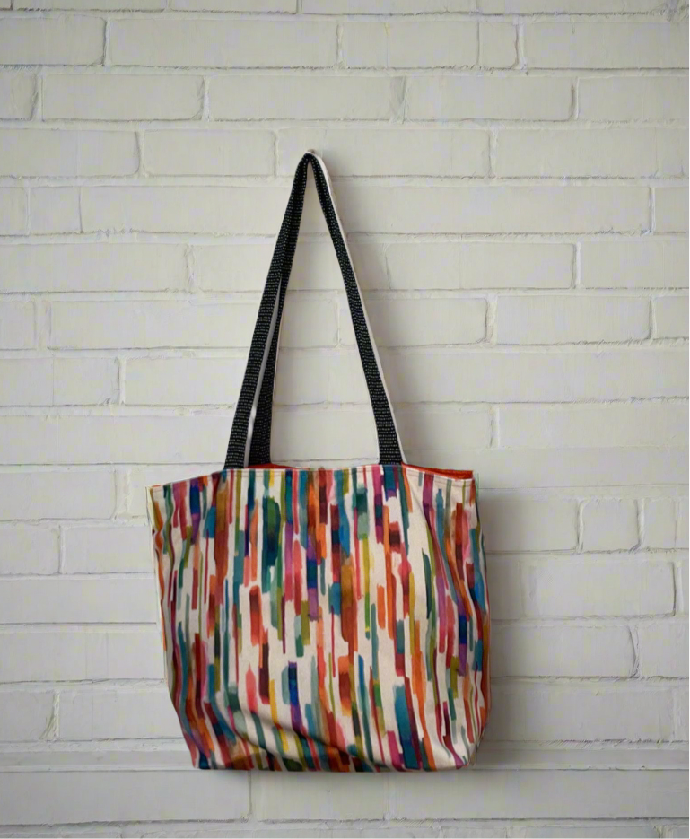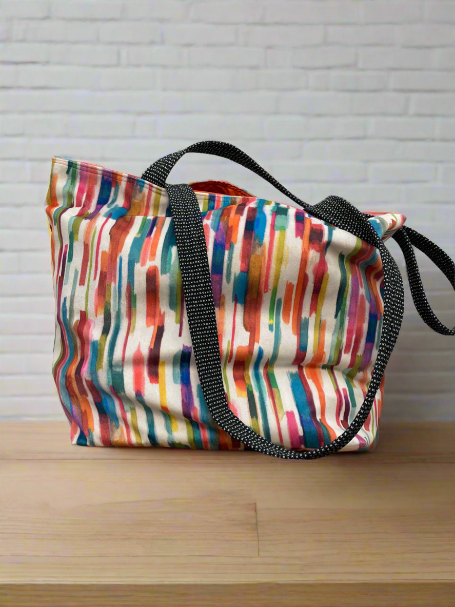 The Candy Rain Tote Bag is a handmade, fully lined, cotton dream. Perfect for summer by the sea. Extra roomy and straps long enough to wear across your body. This beautiful piece is 1 of 1. A customer to our Kings Cross Op Shop makes these bags for us to sell. When he walks in the door to donate them, the store quite literally stops and everyone starts ooohing and ahhing over his handiwork. We sell them within the day!
