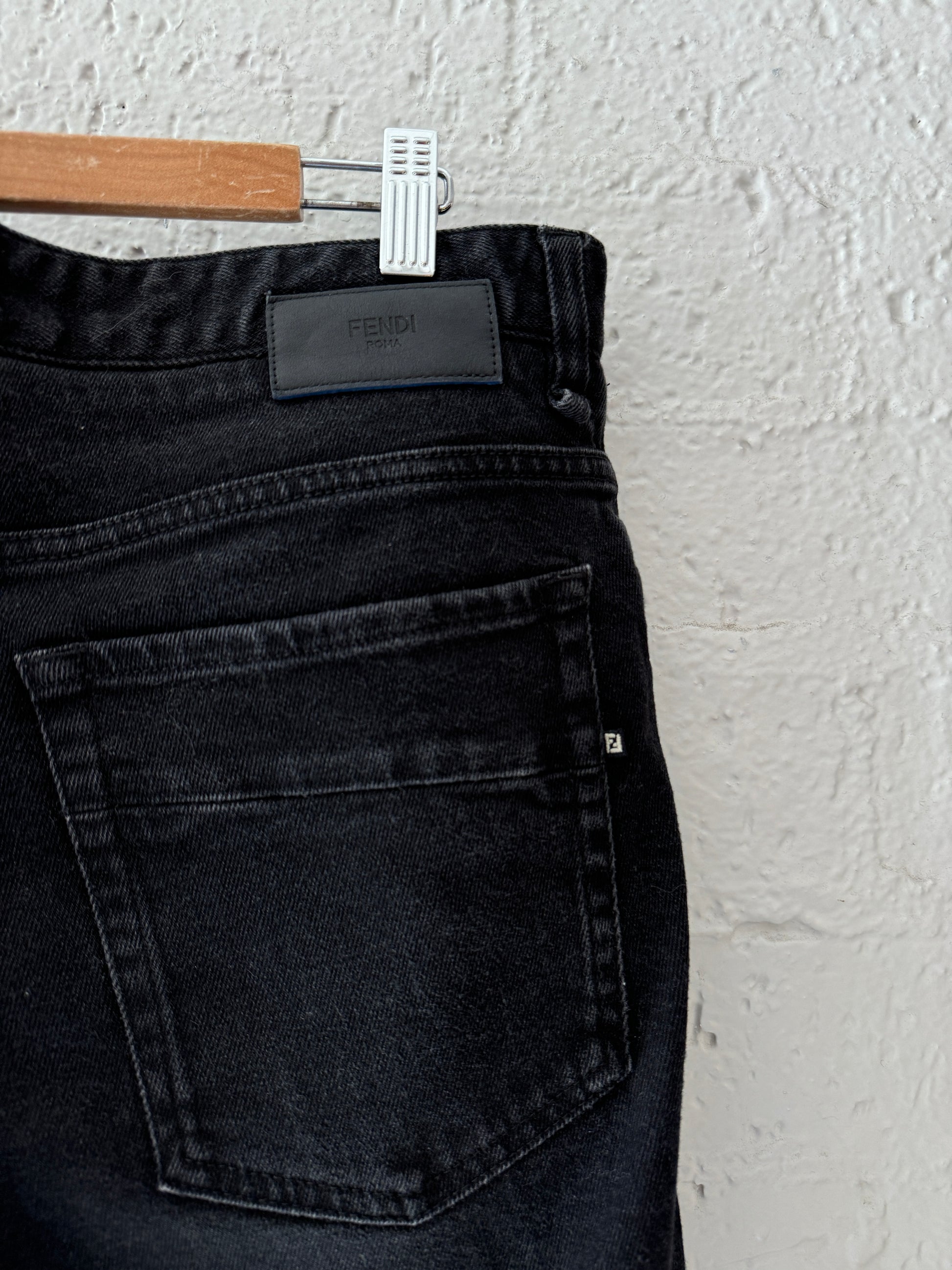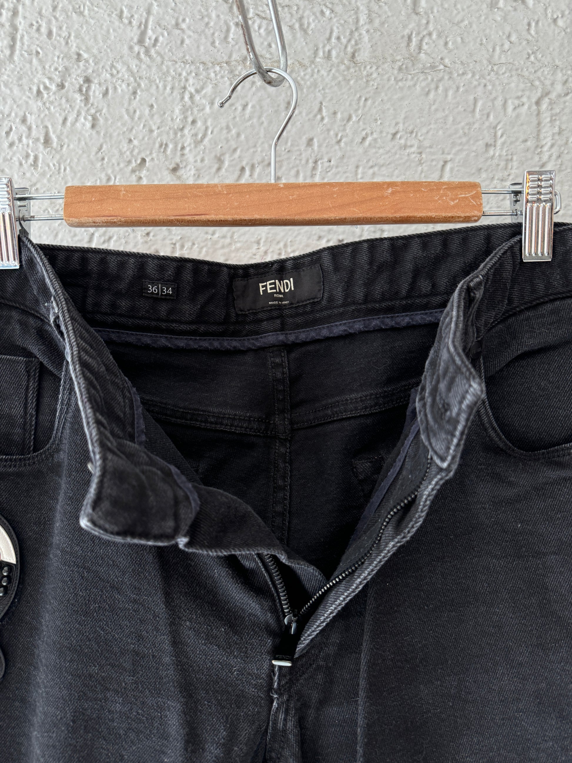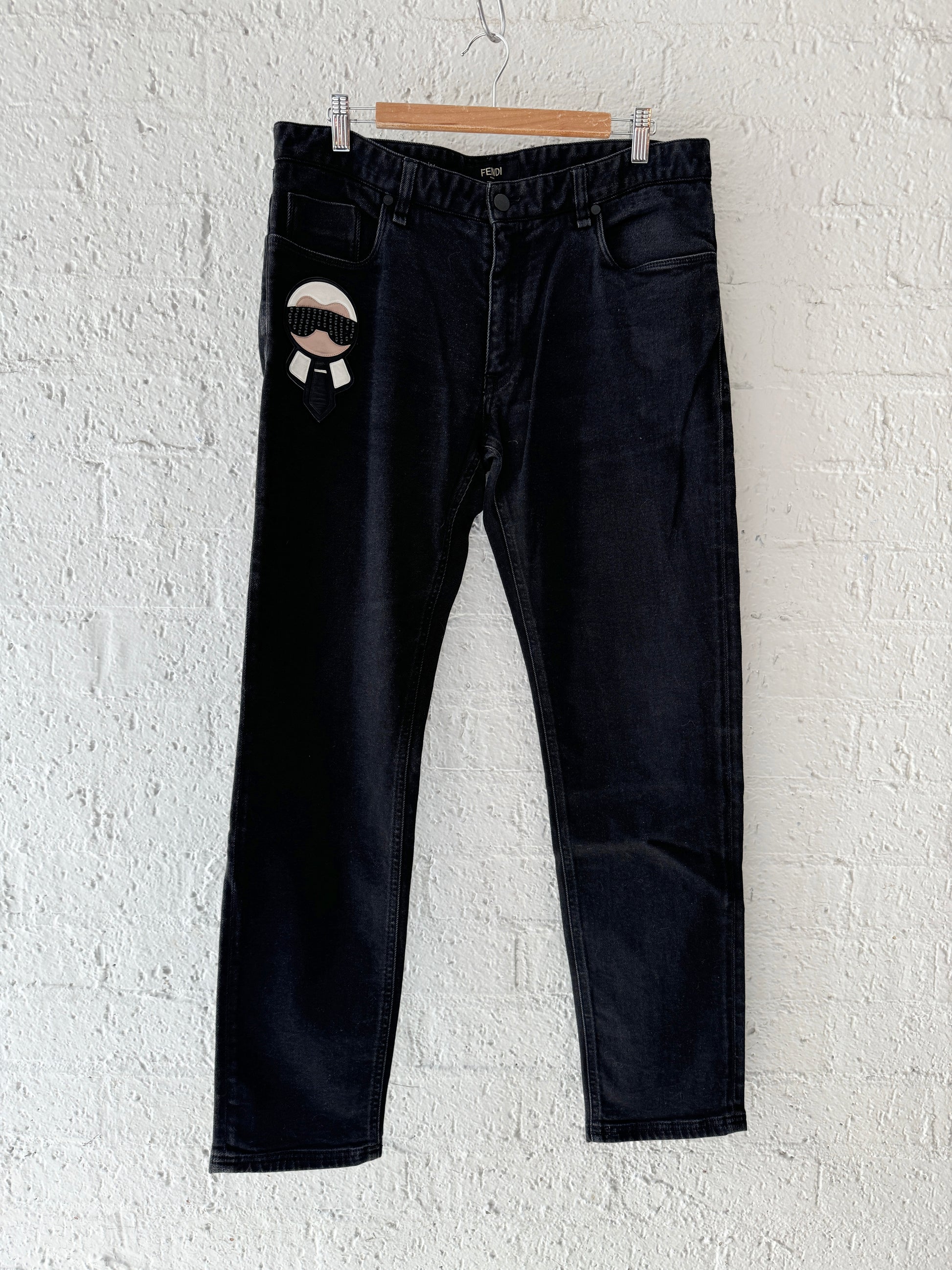 Fendi by Karl Lagerfeld black jeans. 36 waist 34 leg. 98% cotton 2% elastane. Missing one ball on the Lagerfeld patch. RRP $1280