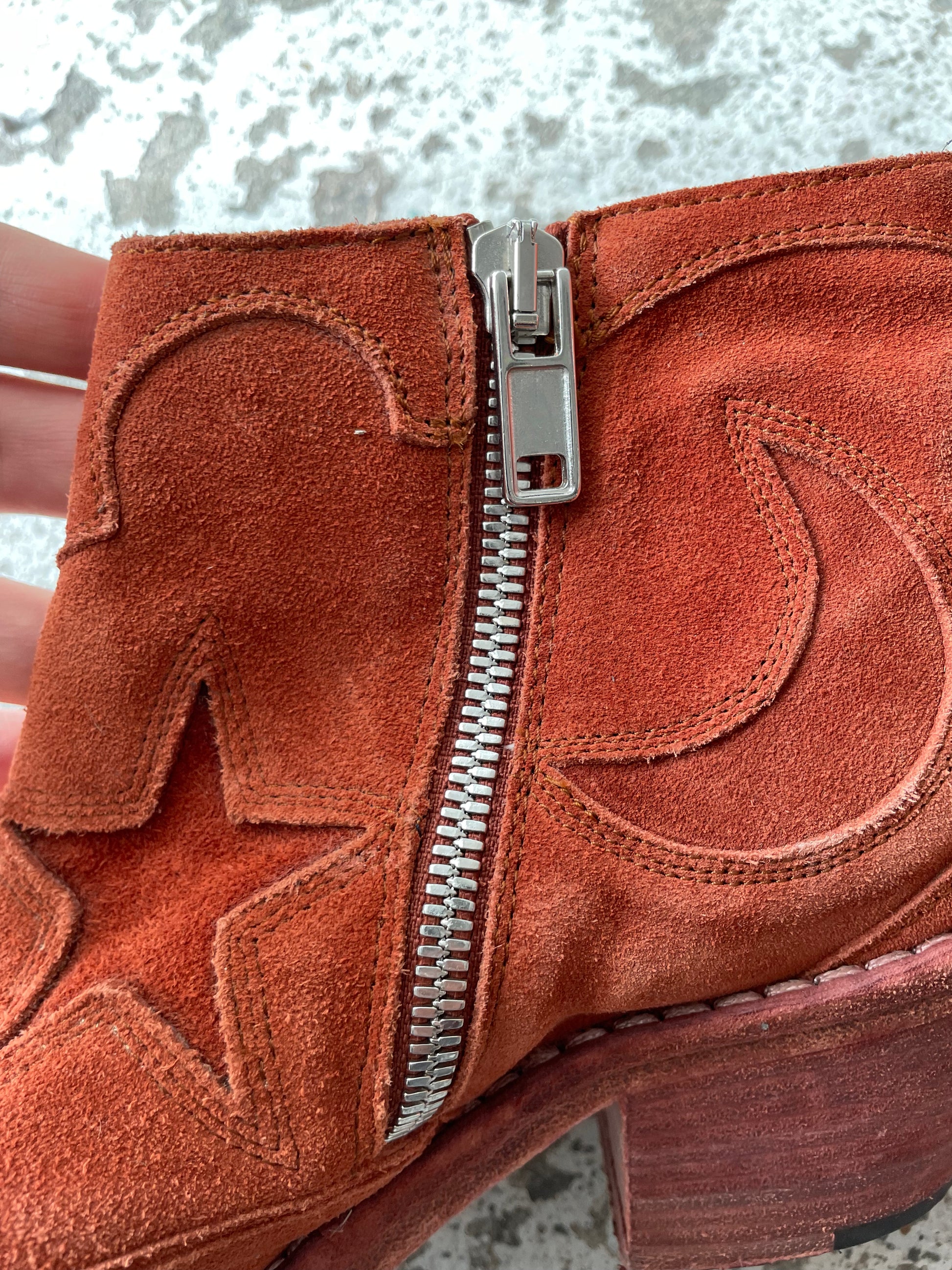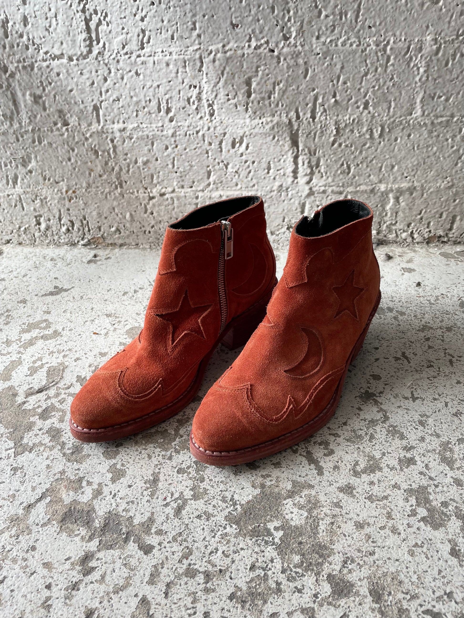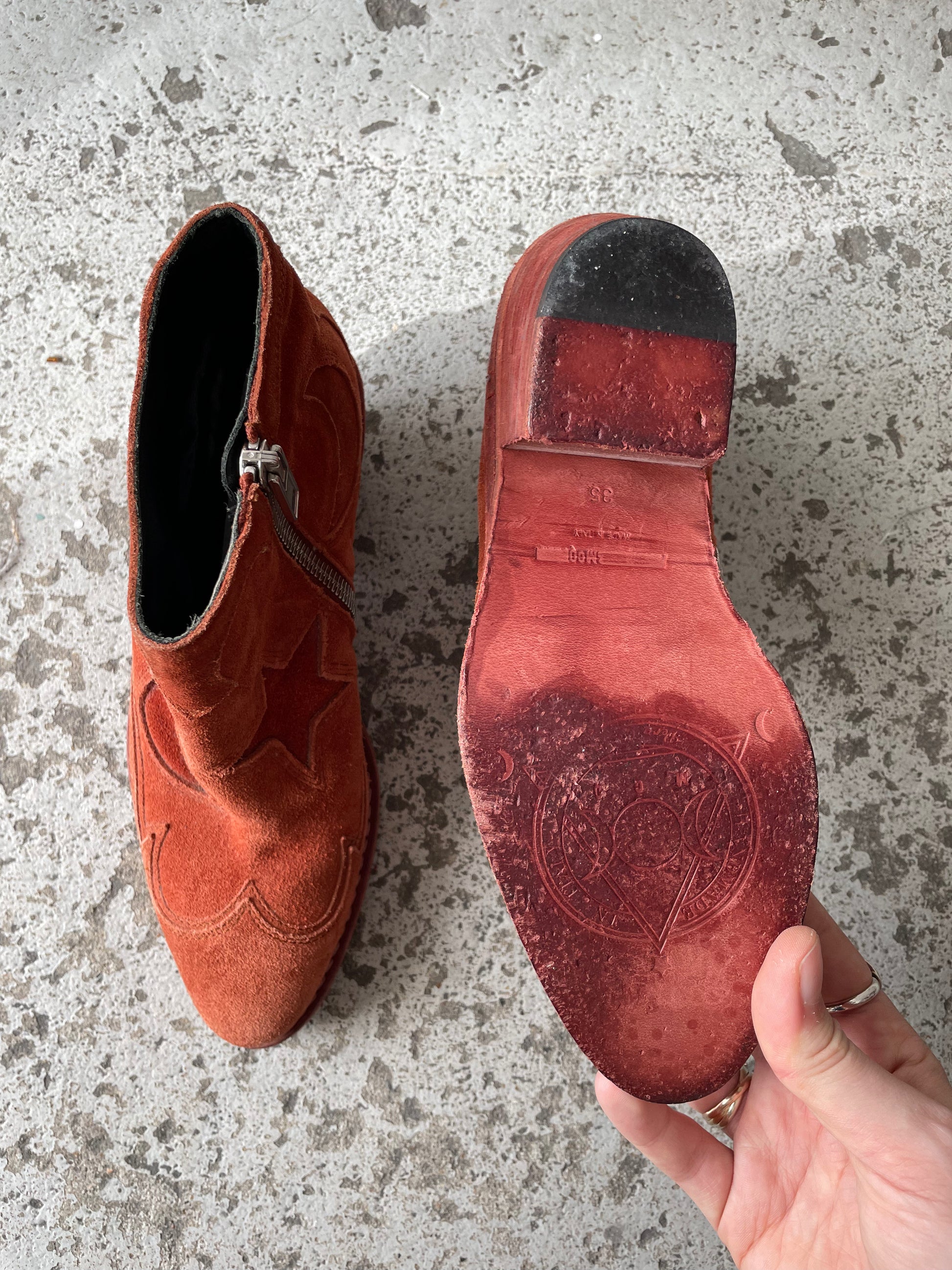 McQ by Alexander McQueen suede ankle boots in a size 35. Silver hardware. Made in Italy.