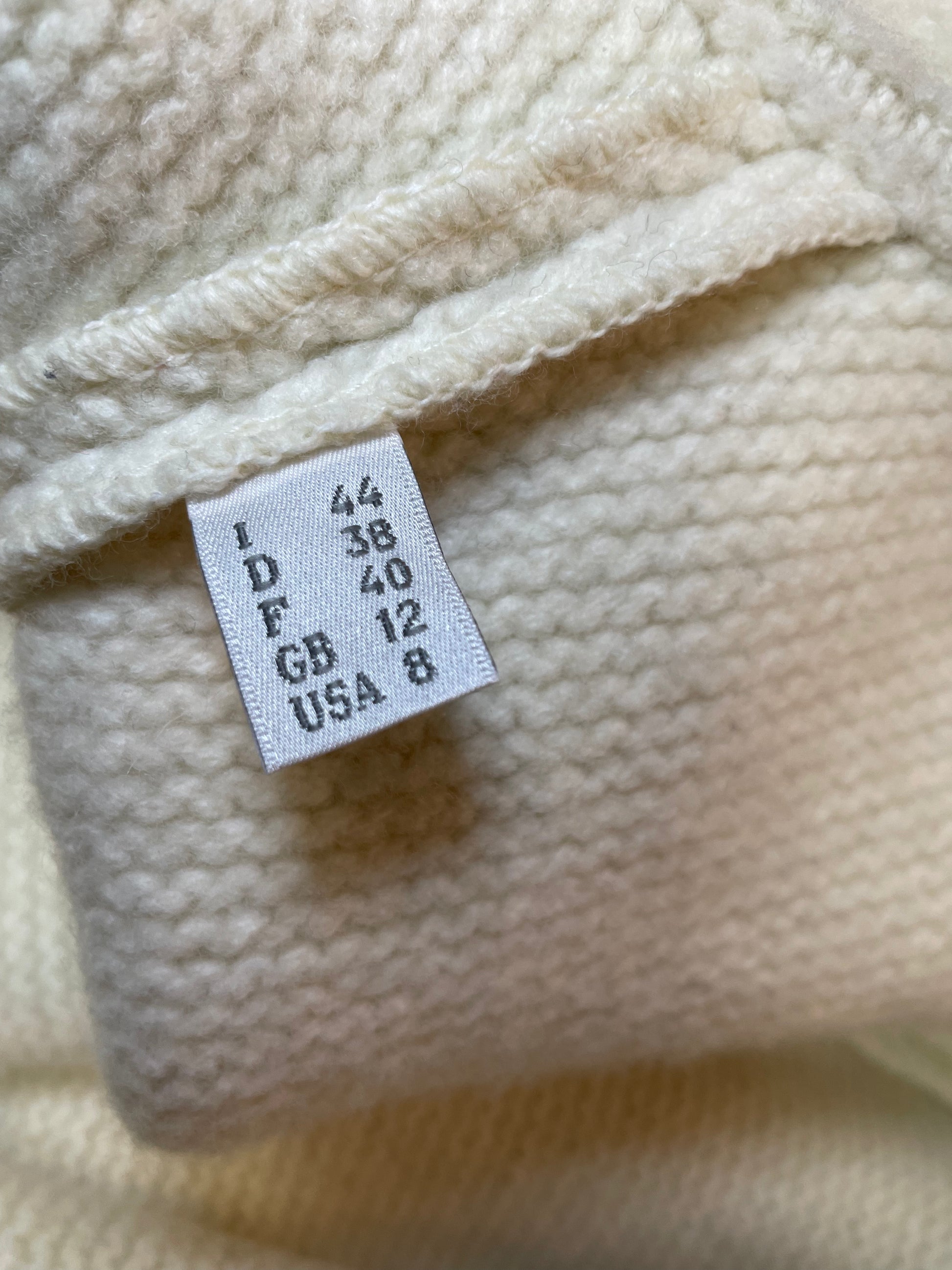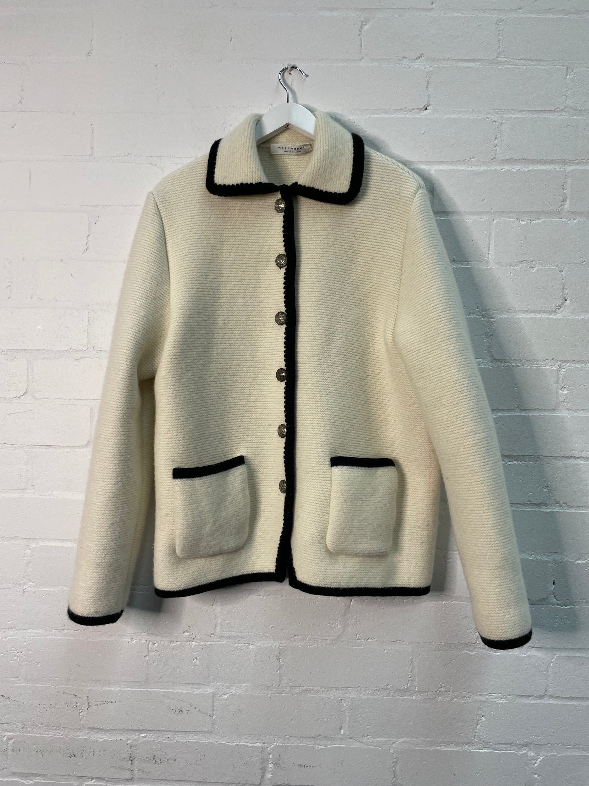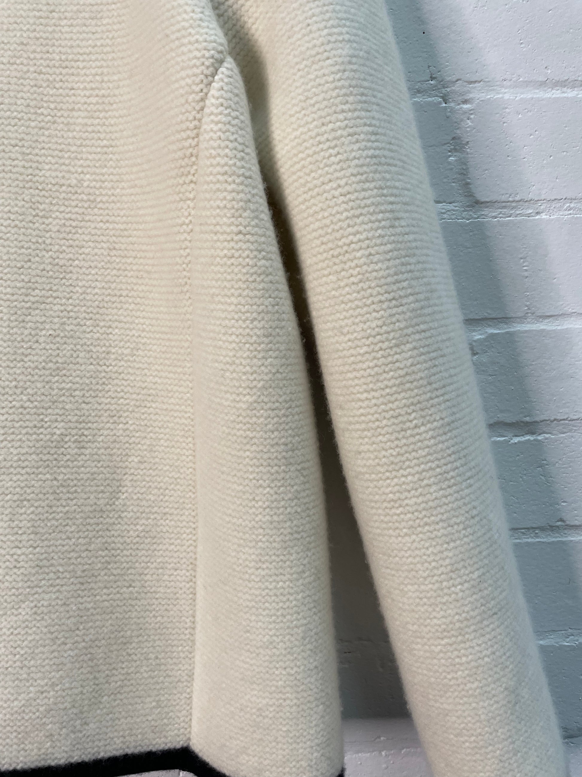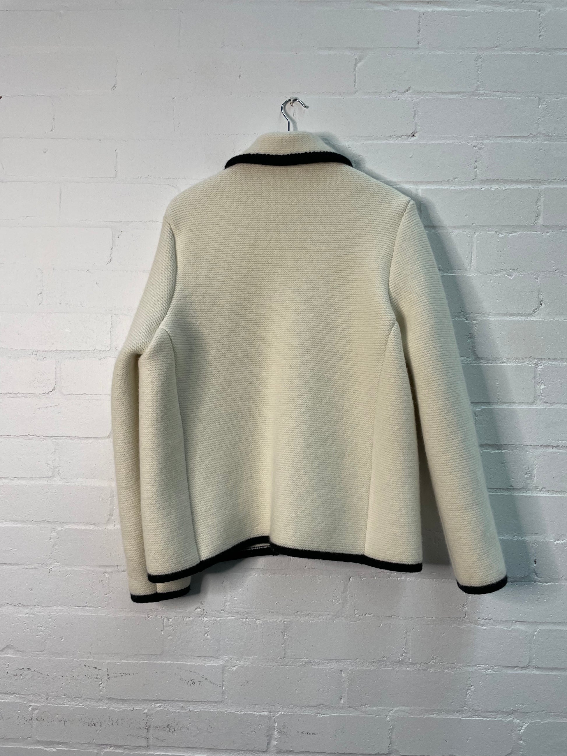 Extra fine merino wool jacket with contrasting edges. The military-style metal buttons emphasize the straight line of the silhouette. Two pockets on the front, profiles in wool, dropped shoulders, front closure with metal buttons. Excellent condition. Still available new online.