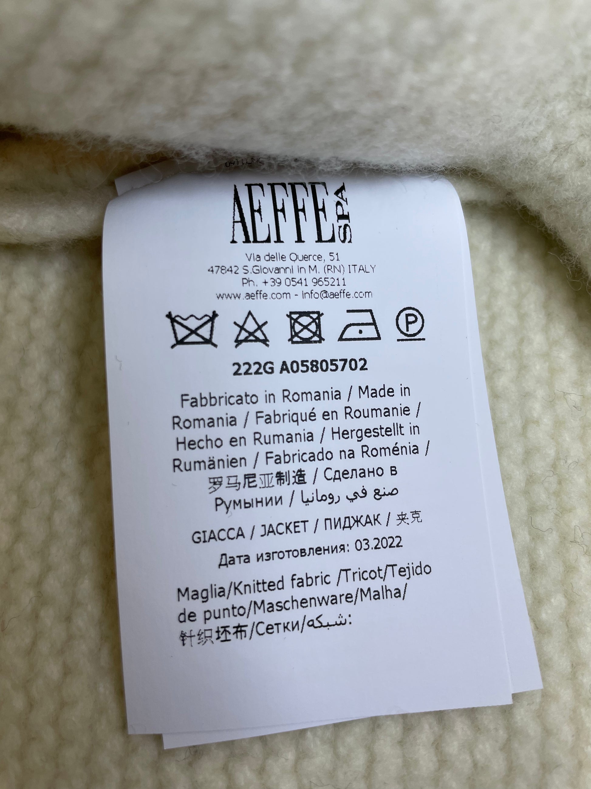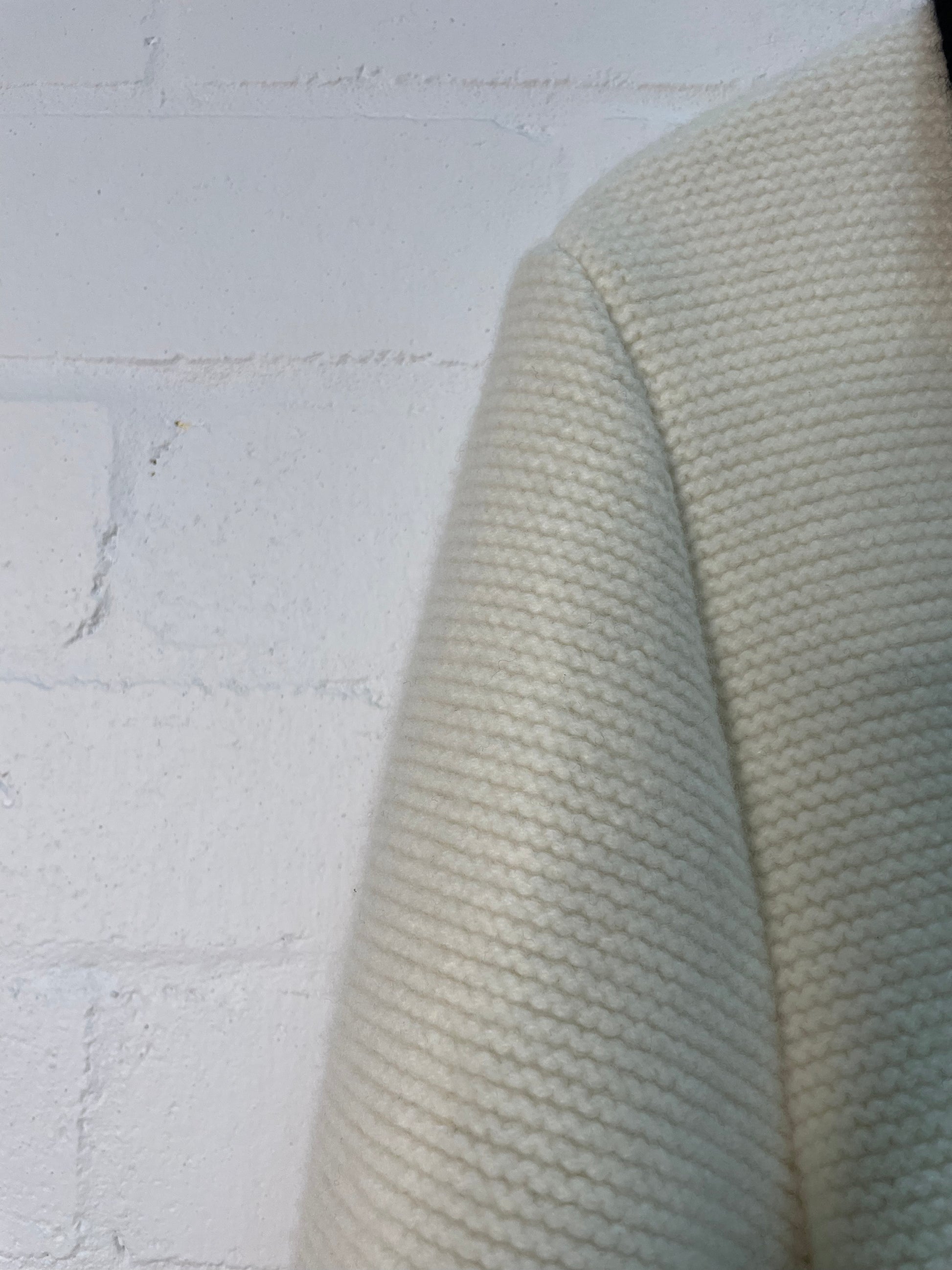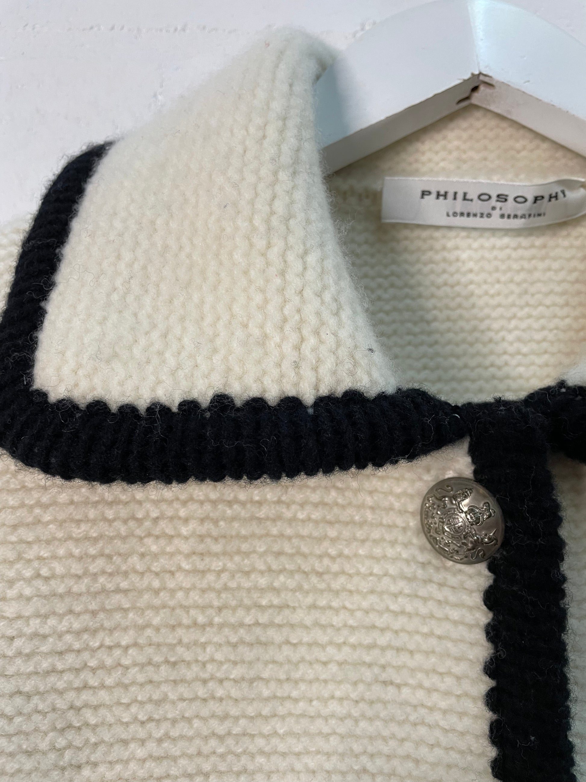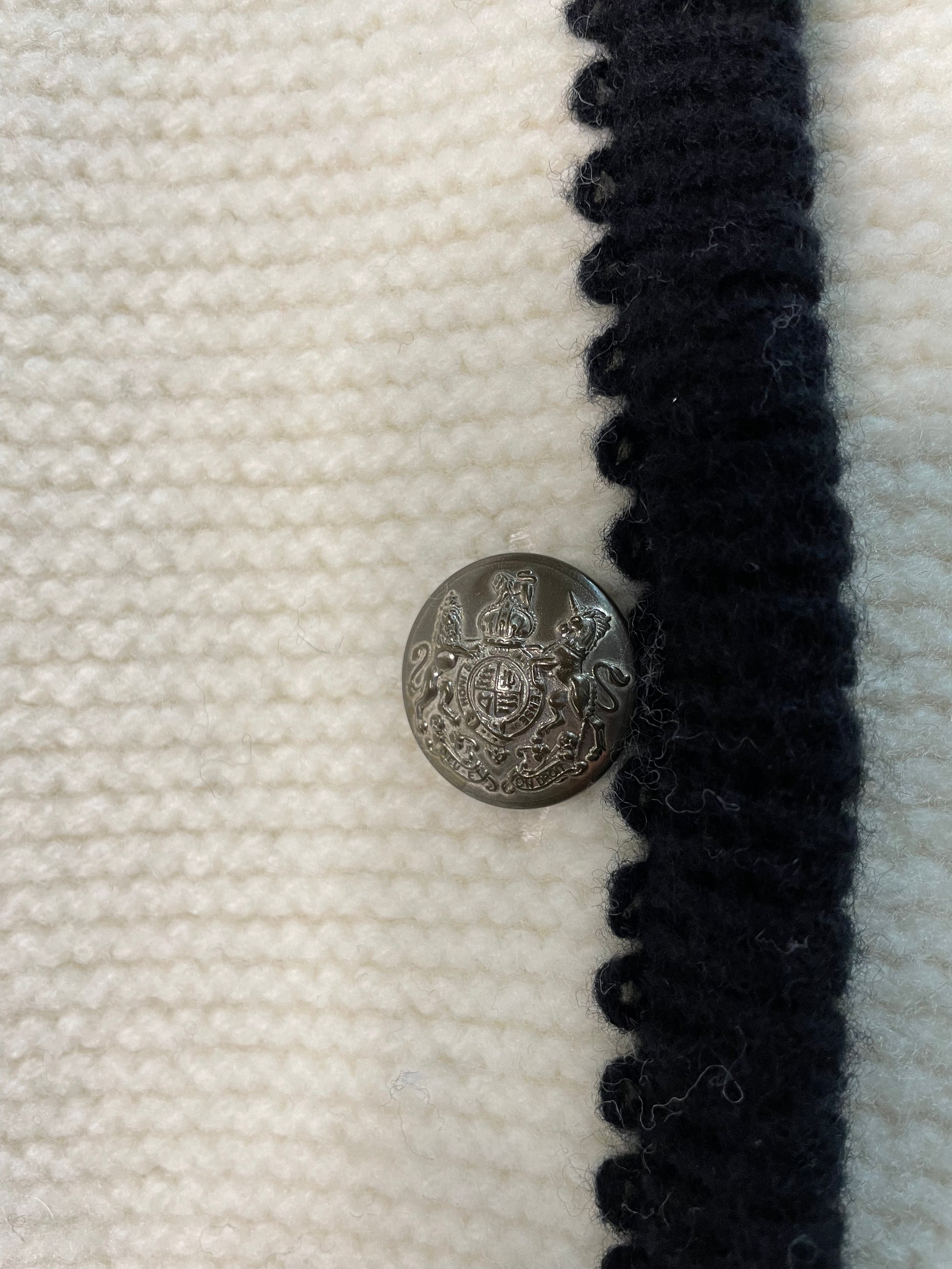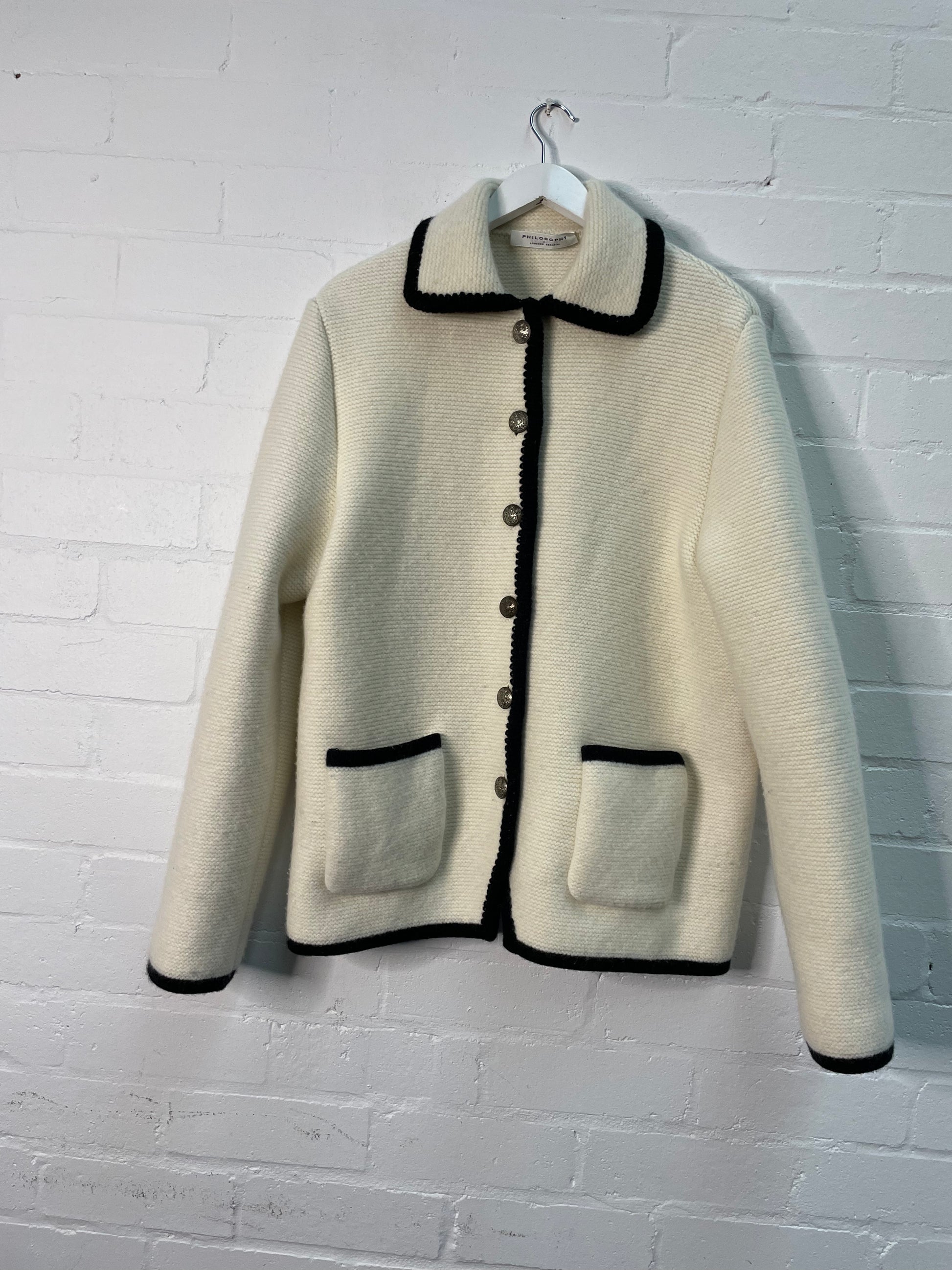 Extra fine merino wool jacket with contrasting edges. The military-style metal buttons emphasize the straight line of the silhouette. Two pockets on the front, profiles in wool, dropped shoulders, front closure with metal buttons. Excellent condition. Still available new online.