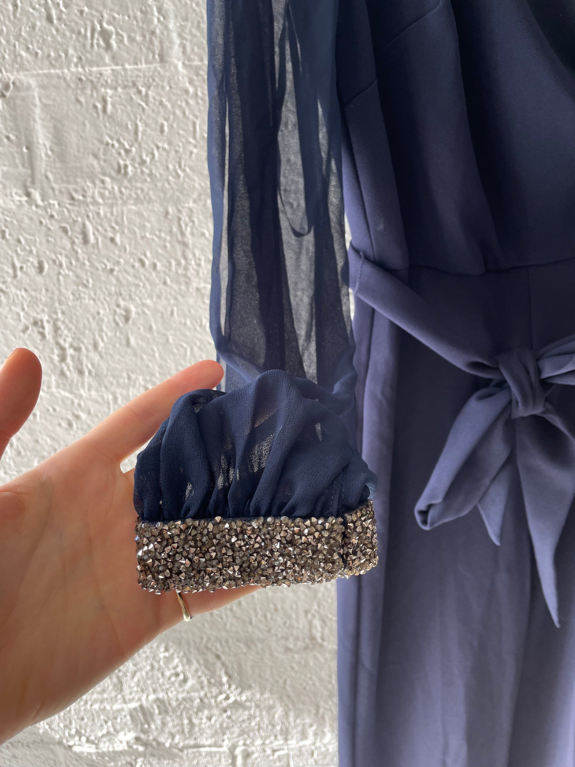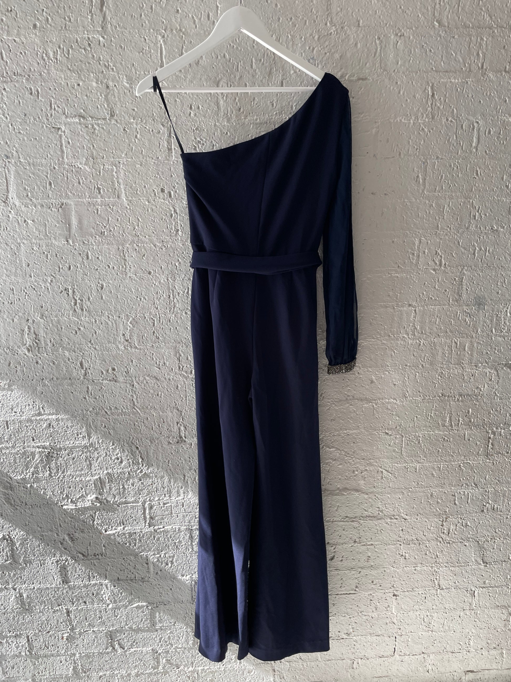 One shouldered Lauren by Ralph Lauren jumpsuit brand new with tags. Size US4 (AU 8). Bejeweled detail on hem of sleeve. Side zip fastening and tie around waist.