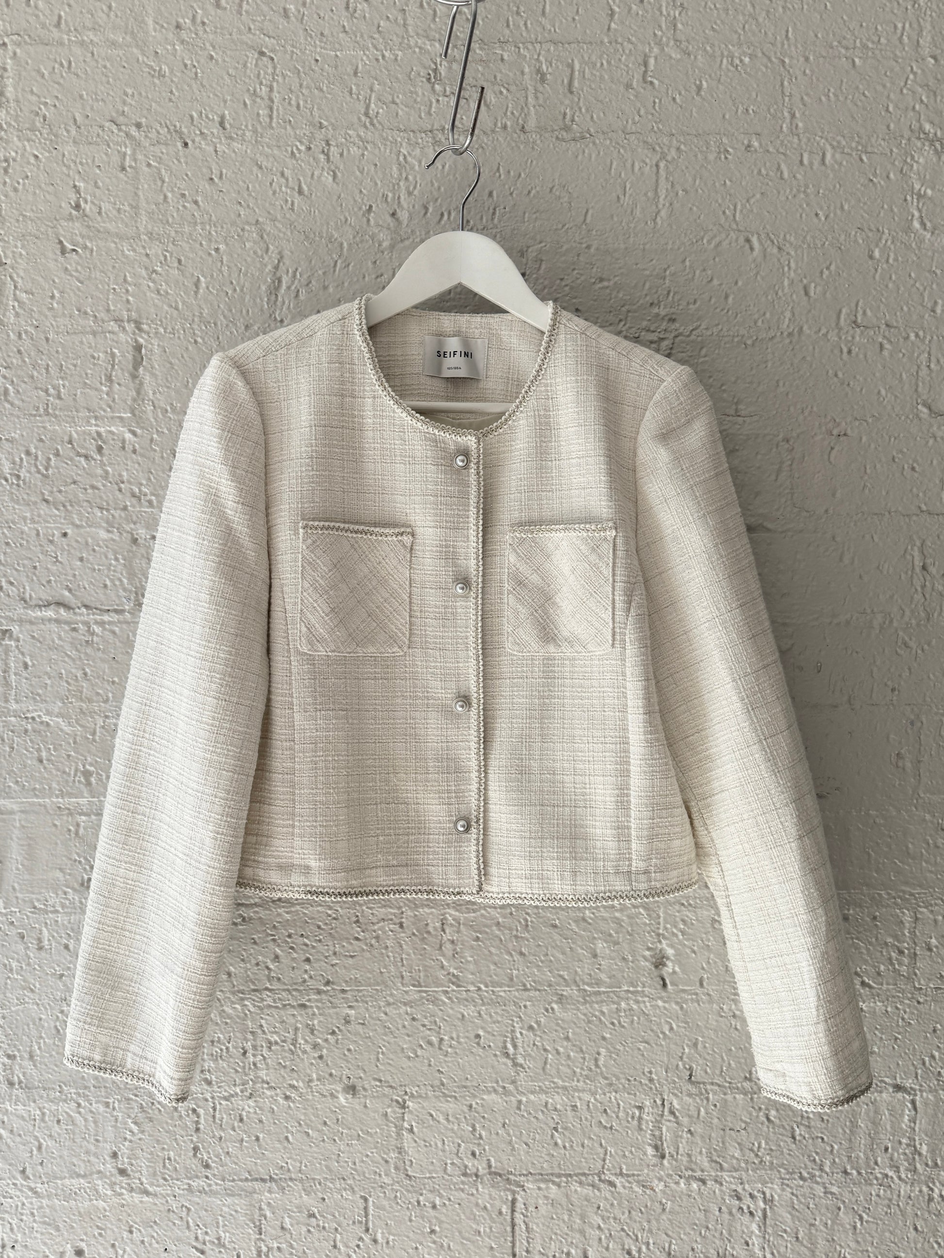 Steifini cropped blazer in a tweed fabric. Tag size reads 165/88A, but would fit an AUS 8. Polyester/spandex blend.